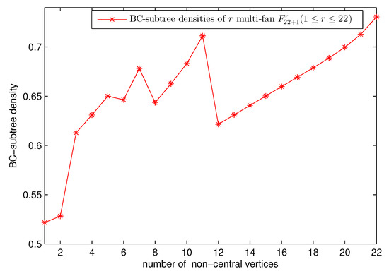 The generating function approach provides us with much more information than just the BC-subtree number. In particular, we will examine the BC-subtree density here, for r multi-fan graph () and , respectively. For some of the work on this topic one may see [40].