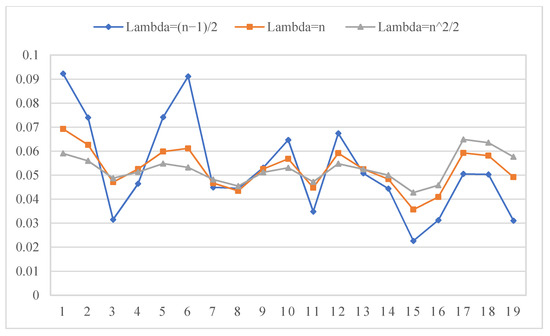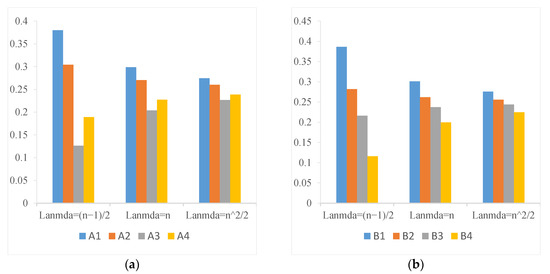 From Figure 2, it is easy to find that parameter has obvious influence on local subjective weight of subattributes. When , the weight differentiation of each local attribute is obvious, but when gradually increases ( and ), the local weight difference of each subattribute decreases, which is close to each other in numerical value. However, it should be noted that regardless of the value of , the priority relationship of attributes at each level is unchanged. For example, for the five primary attributes, no matter what value takes, the priority relationships of attribute weight are wA > wC >wB> wD >wE. In addition, the larger the value of , the closer the distribution of attribute weight to uniform distribution. The smaller the parameter , the greater the gap between the weights. From Figure 3 and Figure 4, we can also find that the global weights of 19 subattributes are also affected by the value of . The smaller the is, the more obvious the difference between attribute weights is, and the priority relationship between attributes is easier to distinguish. Besides, it can be seen from the results in Table 3, whether based on subjective weights or combined weights, parameter has no effect on the ranking results from this case. From the analysis of additive consistency Formula (22), it can be found that when is large enough, the weight gap between attribute i and attribute j can be small enough, but the priority relationship between the two attributes is fixed. Therefore, when takes a smaller value, the sequence of attribute priority relation with more obvious discrimination can be obtained. In this case, we believe that the preference evaluation information is highly reliable. When is large, the weight distribution of all attributes is balanced. In this case, the priority of attributes cannot be clearly distinguished. Therefore, parameter can be flexibly applied to different index systems and DMs with different distinguishing ability. For example, parameter should be set to a smaller value when the index system requires that each index has a more obvious discrimination. If the DMs thinks that there should be some fairness between attributes, then they can set a larger value of .