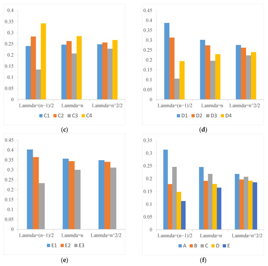The local subjective weights of each subattribute from different parameter . (a) The subjective weights of subattributes in attribute A; (b) The subjective weights of subattributes in attribute B; (c) The subjective weights of subattributes in attribute C; (d) The subjective weights of subattributes in attribute D; (e) The subjective weights of subattributes in attribute E; (f) The subjective weights of attributes A–E.