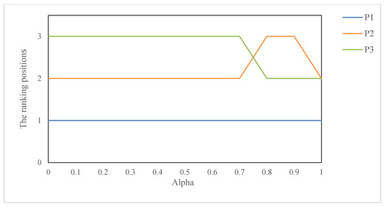 It is easy to find from Table 4 that when only the objective attribute weights are used, the ranking results are the same as that of the combination attribute weights, however, when only subjective weight is used for ranking, although project is the best one, the priority relationship between project and project cannot be distinguished. This shows that different attribute weights may have different effects on the evaluation results. In order to further explore this rule, we make the combination weight , and then observe the influence of parameter on the ranking results. The specific experimental results are shown in Figure 5.