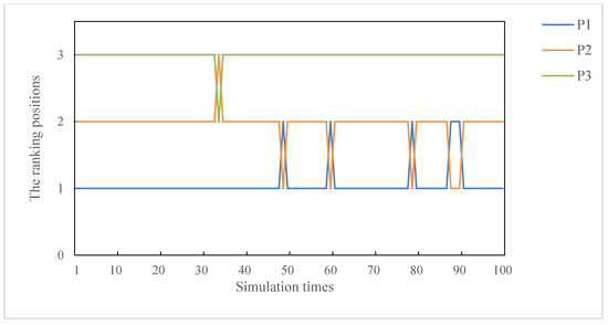 From Figure 5, we can find that when the combination weight is close to the subjective weight obtained in this study, the ranking results change. However, on the whole, we think that the ranking results obtained from the proposed method are relatively stable in response to the attribute weights. In order to further verify our conjecture, we randomly generate 100 groups of subjective weights for simulation experiments. The experimental results are presented as Figure 6. Based on Figure 6, we can easily find that the proposed ranking method is relatively stable, and the specific advantages will be discussed in detail in the comparative analysis in the next part.