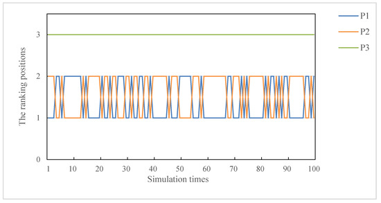 From Table 5, we can see that the ranking results obtained by the method in [15] is the same as that obtained by our method. Their best project is all , while the best project obtained by the method in [14] is . This indicates that our novel method is effective. In addition, it should be noted that the expected values obtained by method in [14] and method in [15] are very close and difficult to distinguish. So, we have such a question in the brain, whether the ranking results obtained by methods in [14,15] are easy to be affected by attribute weights. Because the two methods also consider the objective weight of attributes with the help of power mean operator, we use the following experiments to verify our conjecture. Specifically, 100 groups of subjective weights are randomly generated, and the method in [14] and the method in [15] are used to process the evaluation data of this application case, and the ranking results are presented in Figure 6 and Figure 7.
