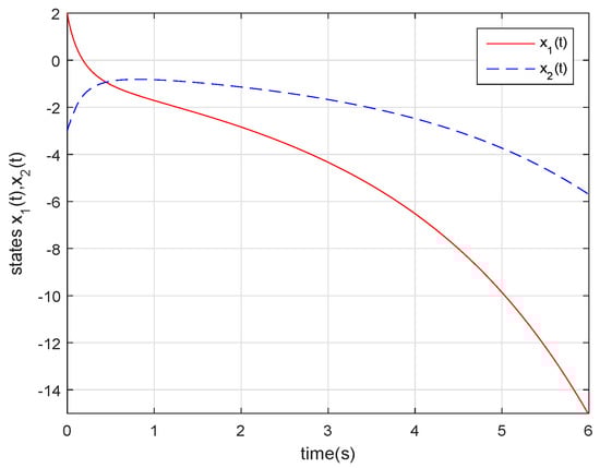 Let us consider and the initial state . Figure 1 and Figure 2 show the minimal upper bound of the generalized cost , time response of the selected system without and with the control input, respectively. Form the two figures, we can observe that the states of system without input control is divergent, and that the controlled system is convergent.