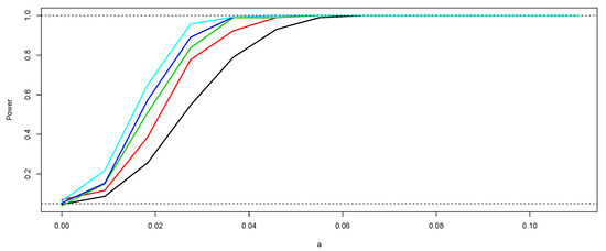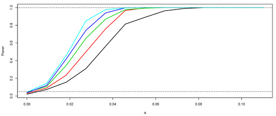 Empirical power of the sign test according to and n. The black curve corresponds to the power of the test for and the light blue curve to the case of . The other curves correspond to (red), (green), and (dark blue).