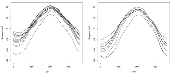 Temperature curves (in Celsius degrees) of the Atlantic (left) and Continental (right) climate zones obtained after daily data averages are smoothed using 65 Fourier basis functions.