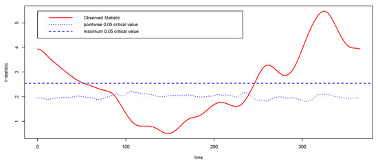 where is some known fixed function. A review of alternatives to test the hypothesis in (3) is given in [13], where pointwise, -norm-based and F-type tests are introduced, among others. Almost all of these tests are based on the Gaussianity assumption, that is, they assume that , for each t. The simplest option in this case is the pointwise test. Under Gaussianity, we have