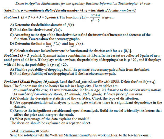 The exam was taken by 68 first-year students in the specialty of Business Information Technologies at the Faculty of Mathematics and Informatics, University of Plovdiv Paisii Hilendarski, Plovdiv, Bulgaria. According to the first trimester curriculum, these students have taken a linear algebra and analytic geometry course, and during the second trimester, the course in Information Technology for Mathematics, where students are trained to use Wolfram Mathematica to solve mathematical problems using a computer. The current course in Applied Mathematics is in the third trimester.