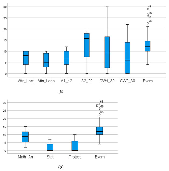 Descriptive statistics of the variables used in the study are given in Table 2 and the distributions in the form of box plots with unstandardized data are shown in Figure 2a,b. Table 2 and Figure 2b show that the mean values of the results for Stat and Project are quite low, and their median is 0. The reason is because only 31 students, or 45%, worked on the project. In addition, Table 2 and Figure 2a,b lead us to the conclusion that most of the variables are not normally distributed (A2_20, CW_30, Stat, Project etc.). This is evidenced by the relatively high values of the ratios of skewness/std. error of skewness, kurtosis/std. error of kurtosis, as well as from the box plots. For example, for the target variable Exam we have the ratios and , which is an indication for non-normal distribution of the variable. In addition, a one-sample Kolmogorov–Smirnov test with Lilliefors significance correction was applied, which reaffirms that Exam did not follow a normal distribution as the calculated p-value is 0.000. Furthermore, the relationships between the variables are hidden and possibly highly nonlinear.