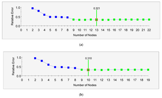 Relative error of the constructed classification and regression tree (CART) models depending on the number of terminal nodes: (a) m1 = 5, m2 = 2; (b) m1 = 6, m2 = 3.