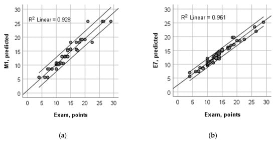 The results obtained are comparable to those obtained by us in [6], where regression-type CART models were constructed to predict the final exam results in linear algebra and analytical geometry for students in two other specialties at the same university, using a short mathematical competency test and mid-term test results. In [6], the models reached to fit the actual data with . The results obtained here are also similar to those in [11,13].