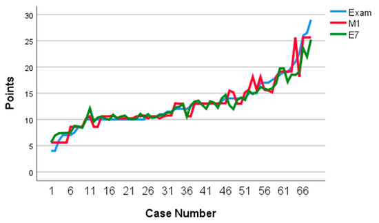 Figure 7 presents line plots of Exam and model predictions obtained by models M1 and E7. For both models there are larger differences with Exam at the highest values.