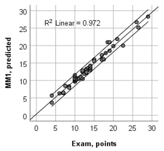 The idea arose to combine the four best models—two CART and two CART-EB models for regression of the dependent variable Exam. A linear MARS method was applied. Three models with predictors M1, M4, E6 and E7 were built. The models showed very close goodness-of-fit indices. The final model selected, MM1, used M1 and E7 and achieved RMSE = 0.804 and Theil’s accuracy coefficient This model showed a significant improvement in the prediction of the lowest and highest exam scores.