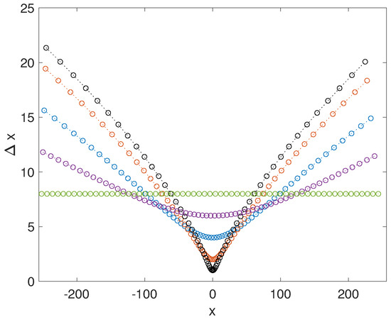 The step sizes from (3) as a function of x. The horizontal equi-spaced case is . The step size becomes increasing variable as a ascends through the samples and (the extreme graph). The step size near the origin vanishes as . The domain has length , with points.