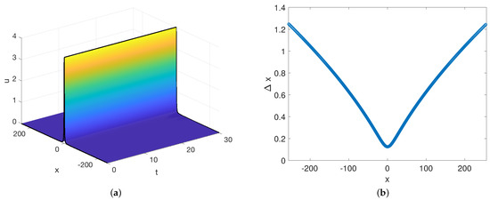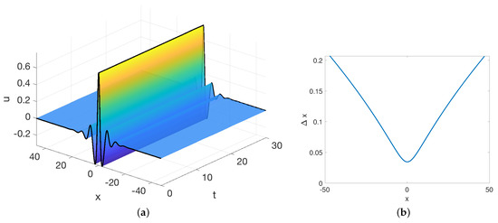 (a) The soliton solution propagated on a domain . (b) The step-sizes used for the RBF-FD discretization used in the left simulation.