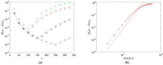 The infinity norm of the error of the numerical approximation of the linear operator, , against the exact on the solitary wave is depicted. (a) The error’s dependence on domain size, L, is compared for the RBF-FD discretization using the spatial points in (3) with (red triangles), (blue circles), and (black squares), and an equi-spaced Fourier discretization (green stars). All of these computations use . (b) The error dependence on the minimal step size for , altering the step size with the parameter “a”. The numerical results are marked with triangles; the continuous line marks .