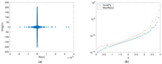 (a) The spectrum of the linear operator used for the evolution depicted in Figure 2. (b) The condition number and the maximally real eigenvalue of the approximation of the linear operator as a function of the step-size parameter “a” in Equation (3), marked with xs, is compared to the condition number of eigenvector matrix, F, of the RBF-FD differentiation matrix times the machine precision, , marked with circles.