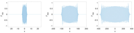 Another complication is the slow decay of the solution as increases. To deal with this complication and with a localized steep gradient in the solutions, we increase the point density where the wave amplitude is large and decrease point density in the far field. This allows for increased accuracy over uniform grids with the same number of nodes. Consideration of non-uniform node sets is a key advantage of RBF based approximations. Even in the context of approximating a non-local operator with local approximations and slowly decaying solutions, we demonstrate accuracy where is the smallest spacing between adjacent points in a node set. We report errors based on this smallest step size, rather than the largest or the number of nodes as in [18,19], because the mapping we use to refine the node set both decreases the step size near important features of the solution and increases the large step sizes elsewhere while keeping the total number of nodes fixed. To further illustrate this method, we present a brief example in another model equation [20].