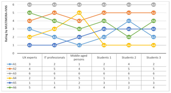 Although all the participants used the same checklist to judge the websites, individual assessments of the heuristics diverged. While the dispersion of the judgements gathered the UX experts was noticeably small, judgements collected from the novice evaluators were much more diverse. For instance, Trust (TR) of the alternative A5 got 17–18 points from UX experts; 14–18 points from IT professionals; 14–21 points from the persons who do not work in IT industries; 13–20 points from the first group of students; 10–19 from the second group of students and 10–20 points from the third group of students. Such inconsistency in the HE results might have a significant effect on the final rankings of the analysed alternatives. Therefore, six separate decision matrices X were constructed for each of the target groups. The decision matrix for expert based judgements is presented in Table 4. Another five matrices were generated in the same manner.