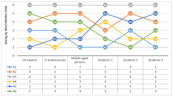 Here, denotes the number of the analysed alternatives and denote the number of the heuristics. Value for each alternative a and the heuristic Hn has to be determined as the interval where is the lowest estimate of the heuristics Hn, and is the highest estimate of the heuristics Hn among all five evaluators that presented their estimates for the heuristic Hn. In this way, the inconsistencies caused by the experience of the evaluators can be recorded for further data processing. We propose to employ MULTIMOORA-IVNS as the appropriate approach to deal with the uncertainty and inconsistencies of the collected data.