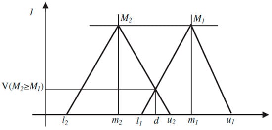 Step 2: For triangular fuzzy numbers, the degree of possibility is expressed equivalently in Equation (7) and is determined using Equation (6):