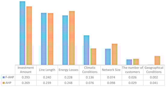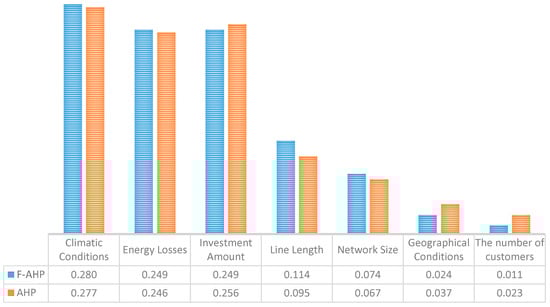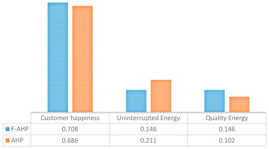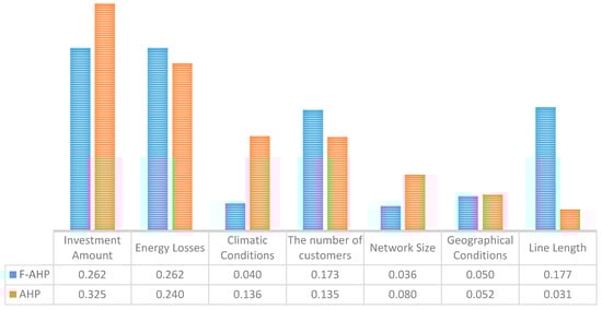Figure 5, the results of the “service area” sub-criterion for the main criterion of customer satisfaction show similar characteristics with AHP, while the “investment amount”, “climatic conditions” and “network size” criteria were found to be more important than F-AHP suggests, where “energy losses”, “number of customers” and “line length” were found to be less important. The “Geographical conditions” criterion seems to have approximately the same value suggested by both methods.