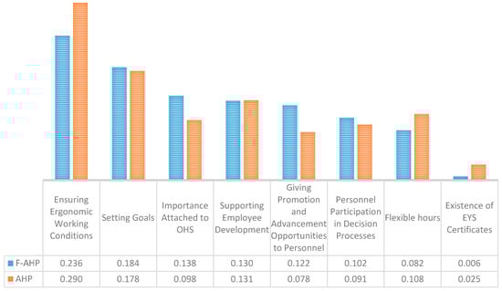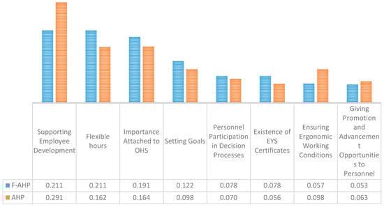 Figure 9, show more importance than the results provided by F-AHP, while “supporting employee development”, “providing ergonomic working conditions” and “providing personnel with promotion and advancement opportunities”, “flexible working hours”, “importance given to OHS”, “goals determination”, “participation in decision-making processes” and existence of EYS certificates” were all determined as being less important by F-AHP.