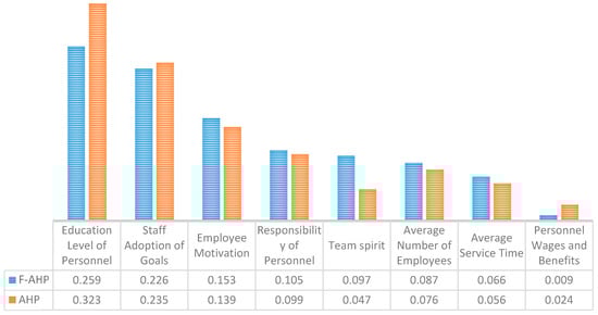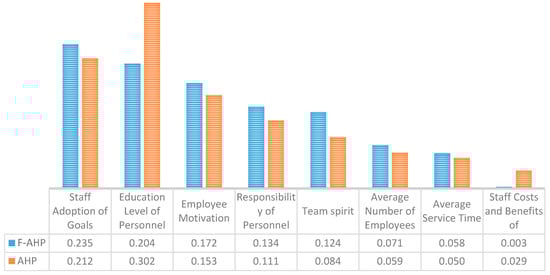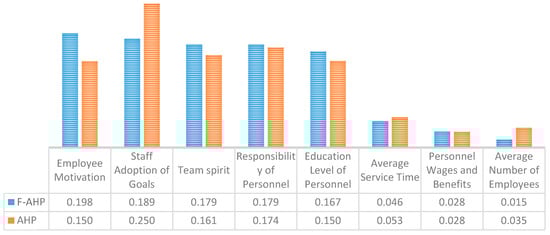 Figure 7, the results of evaluations obtained by both approaches for the “employee” sub-criteria indicate that the “personnel not adopting the targets”, “average number of personnel” and “average service time” criteria seem to be more important for AHP than for F-AHP, while “employee motivation”, “team spirit”, “personnel responsibility awareness” and “education level of the personnel” seem to have the opposite results. The “Staff wages and benefits” criteria has been found to be equally important by both methods.