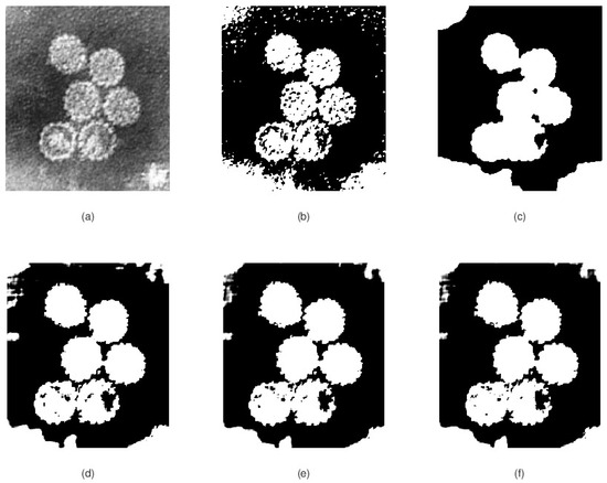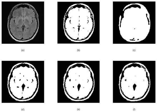 (a) Original input image to be segmented, (b) K-means segmentation results, (c) Chan–Vese segmentation results; and (d–f) our model segmentation results after 1–3 iterations, respectively.