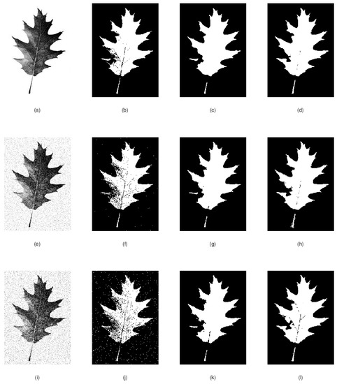 Figure 2 shows the segmentation comparison between three cases: first the input image is segmented ‘as is’, second the input image is contaminated with noise before segmentation and third we double the noise added to the input image. For all three cases, we can also see the results of applying K-means and Chan–Vese segmentation. We see our model successfully removes most part of the noise in Figure 2h,l while still preserving a good approximation for the edges on the leaf object (better than both K-means and Chan–Vese).