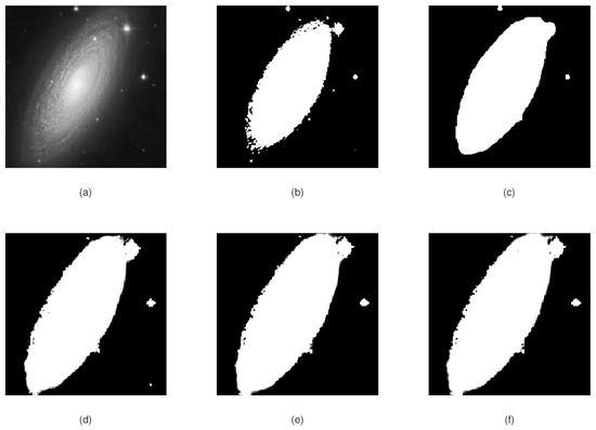 In Figure 3, we see the segmentation results for a blurry boundary object as galaxy boundaries are slowly fading. Even after one iteration, our segmentation is superior to K-means and Chan–Vese as the real galaxy boundaries are correctly identified in Figure 3d.