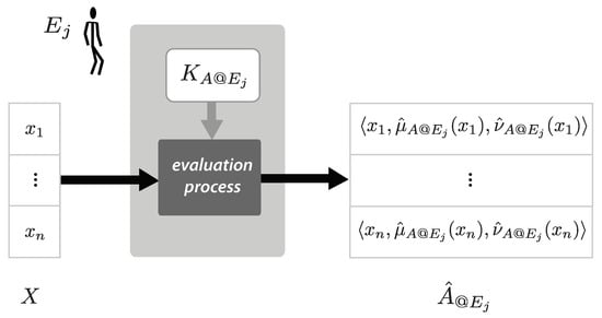 In circumstances where hesitates about the level to which satisfies p, such an evaluation can be better described in the framework of intuitionistic fuzzy sets (IFSs) [31,32]. In this framework, the evaluation can be characterized by an IFS element , in which the components and respectively represent the levels of membership and nonmembership of to the IFS . Thus, the evaluations performed by can be denoted by an IFS, say , such that