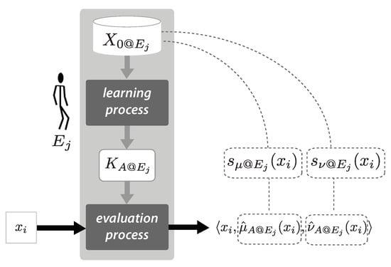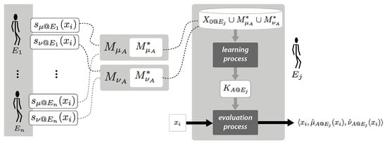 During the evaluation of an option, an expert can recall one or more samples that show what he/she understands as suitable (or unsuitable) options for a given problem. Since such samples have an influence on his/her evaluation, the expert can use them to put the evaluation in context –cf. [34,35] where similar ideas have been used to handle subjective evaluations carried out by persons with different background. For instance, Figure 2 depicts a case in which an expert, say , considers as a good sample to put the evaluation of satisfying the proposition ‘ IS A’ in context, which is reflected in the AAD . In this case, also considers that is a good sample to contextualize the evaluation of the level to which dissatisfies ‘ IS A’, which is reflected in the AAD . Notice that and are part of the training collection used by to acquire the knowledge about the (collection A of) suitable options. This knowledge is then used during the evaluation of the potential options included in a collection .
