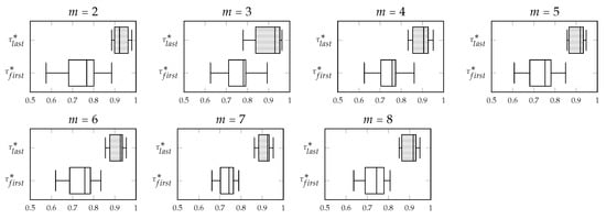 To measure the effect of the updated (knowledge) models on the level of consensus, the collective concordance indices and , corresponding to the first and last rounds respectively, were computed in 420 simulated FAST-CR-XMIS processes. Each category , each number of experts and 10 different test collections, say , each containing between 15 and 19 newswire stories, were used as input of these FAST-CR-XMIS processes. The results are presented in the next section.