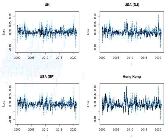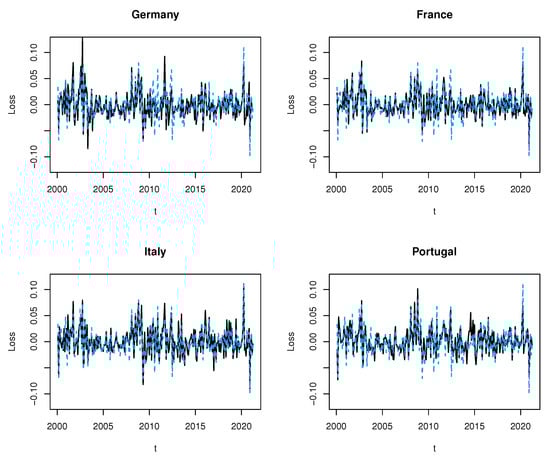 Losses of Spanish stock market index (dashed line in blue) and stock market indexes of four countries in the European Union (solid line in black).