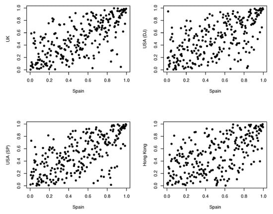 Pseudo-data for each bivariate copula between Spain and UK, USA (DJ and SP) and Hong Kong.