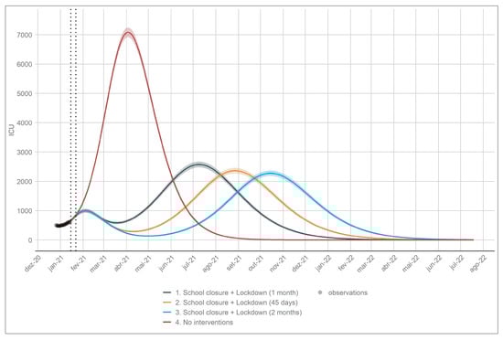 On the 15th of January 2021 the Portuguese government instated a new state of emergency similar to the one implemented in March of 2020 in order to curb the high number of incident cases, hospitalisations and deaths related to COVID-19. Schools were also closed on the 22nd January. In order to evaluate the impact of these interventions and measure their future effect on ICU admissions we consider the following simulation: (a) we assumed that the lockdown and school closure had the desired effect in transmission reduction on the same day of their implementation; (b) we assumed that the reduction in contacts upon implementation to be the same as the one estimated for the first lockdown in March of the previous year; (c) we created scenarios for no interventions, 1 month, 45 days and 2 months of school closure plus lockdown; (d) we assumed that once the lockdown was over and schools reopened the increase in contacts was the one estimated for August of 2020.