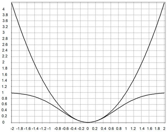 As follows from Equations (8)–(10), an important role is played by the choice of the function f, which is used to determine the quality criterion of the approximation. It can be pointed out that similar approaches were previously used in problems of approximating functions from experimental data. For example, the Hough transformation [] assumes, instead of analyzing image pixels, the synthesis of hypotheses about the presence of a line with certain parameters and counting the number of image pixels belonging to each of these lines. Similarly, “voting for hypotheses” is implemented, which is mathematically similar to performing a probabilistic estimate.