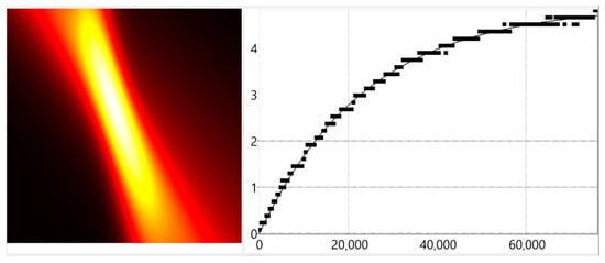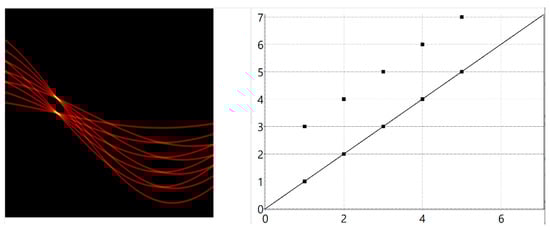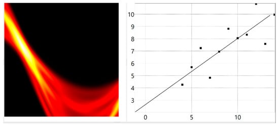 If we introduce the criterion of the quality of an approximation in the form of a function that takes the maximum value when the distance between the pixel and the generated line representation is zero, then the search for a set of parameters for a straight line can be performed by maximizing Equation (7):