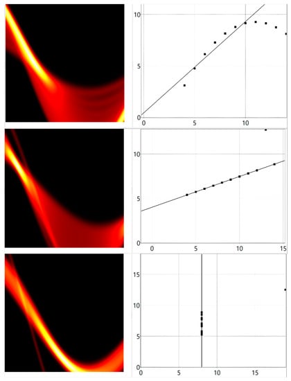 From Equation (11) it can be seen that Equation (10) can be reduced to the Hough transformation by passing to the limit if the approximation quality function is presented as a delta function (according to the principle of the presence or absence of a pixel). The possibility of using nearby pixels for analysis appears when using functions that make sense of the probability of deviation of pixels in an image from an idealized line representation with specified parameters. This property seems to be significant in the analysis of high-resolution images, where graphic objects, visually perceived as straight lines, have deviations from the idealized straight line when they are presented in a discrete form using a video matrix subject to interference.