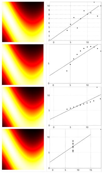 The data presented in the Anscombe quartet were analyzed using the method described in this paper. The purpose of this analysis was to identify the ability of the method to distinguish between datasets based on the quantitative characteristics obtained. We used the representation of a straight line in Equation (8), with several options for the values of the scale σ. A probabilistic representation of the result was used, since it involves finding the maximum probability (and not the minimum distance in a nonlinear distance space), which provides a better visual representation of the results. The analysis results are shown in Figure 2, where the left side of the figure visualizes the value of the probability function depending on the parameters (θ, p), and the right side shows the corresponding datasets of the Anscombe quartet with superimposed straight lines corresponding to the maximum of the probability function.