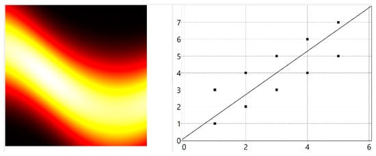 In Figure 4 it can be seen that the assumed straight lines corresponding to the analytically specified functions y = x and y = x + 2 are reflected in the graph of the function P as two bright points corresponding to the local maxima of the probability function for these hypotheses. At the same time, an increase in the scale of σ to a value of 5, exceeding the distance between the straight lines, led to the obtaining of the “averaged line.” This allows us to talk about the possibility of managing the results of the analysis by choosing such a scale of the probability density function that most adequately reflects the processes occurring in the system under study and measuring devices.