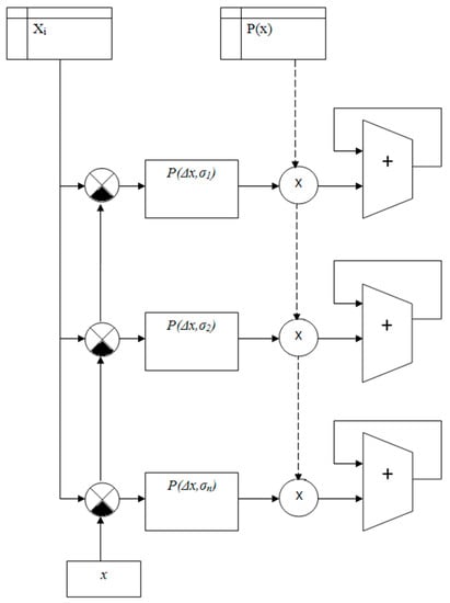 The essence of the approach considered here is to accept a probabilistic hypothesis of the form “the quantity has a real value equal to Xi.” Then, the probability that the observed (measured) value will have a value x is determined by the probability density function of the error distribution, where the argument is the deviation value Xi − x. In accordance with Bayes’ theorem, the posterior probability that a series of measurements x1, x2, … xn appeared in the process of measuring a quantity with a real value Xi is determined by the formula: