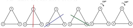 For example consider the cycle graph in Figure 1. The line of symmetry colored by red is denoted by permutation . Hence, the permutations correspond to blue and green lines are respectively denoted by and . A clockwise rotation equal around the middle point of is denoted by and equal by . All of these permutations preserve the vertex adjacency and thus are automorphisms. Note that a rotation preserves the figure unchanged and we denote this permutation by . Hence, the automorphism group of has 6 elements which is .