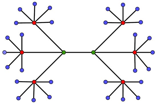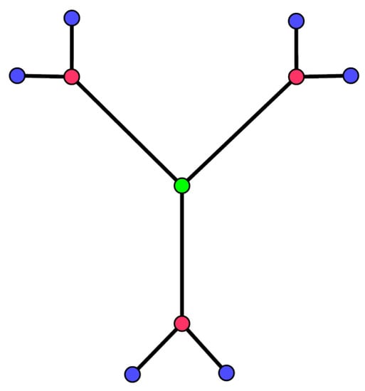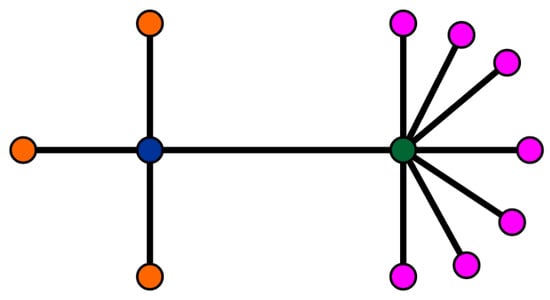 It is well known that each tree has either a central vertex or a central edge []. First, suppose that T has a central vertex. The central vertex gives rise to a singleton orbit, and the leaf vertices are in the second orbit. If the leaf vertices give rise to at least two orbits, then T has at least four orbits, which is a contradiction. Hence, the leaf vertices necessarily lie in the same orbit. The other vertices are in the same orbit, therefore they all have the same degree. On the other hand, the leaf vertices are adjacent to the central vertex because there are only three orbits. This leads us to investigate ; see Figure 7. Clearly, T has vertices, and Theorem 4 gives , where the sizes of the orbits of T are one, n, and , respectively. This means that