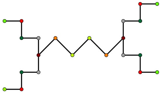 The tree in Theorem 15 for and . It has a central edge. Vertices in an orbit have the same color.