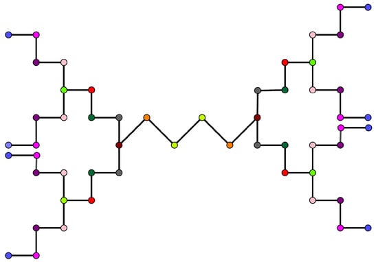Assume that T has a central edge. By a similar argument, it can be proved that T is isomorphic with graph , as shown in Figure 8. Theorem 4 gives , and thus T has three orbits of sizes two, , and , respectively. Therefore, we have that