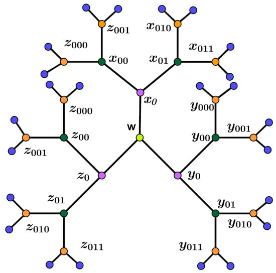 Here, we study the orbit-entropy measure and the symmetry index of another class of dendrimers, namely , shown in Figure 11. For a given vertex , suppose that and X is a subset of vertices of graph G. By , we mean the induced subgraph of G with vertex set X, and two vertices in X are adjacent if and only if they are adjacent in G. The central vertex t has degree three and . There are three branches rooted at vertices , , and . For two vertices , the distance between them is the length of the shortest path connecting them, denoted by . By the ith level of , we mean the set of vertices at distance i from the central vertex w.