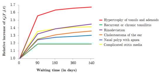 - For a given diagnoses j and a given time interval h ( corresponds to 0–90 days, to 90–180 days, to 180–360 days, and to 360–540 days), the team of physicians agreed upon a worsening factor for each time-dependent variable . This factor represents by how much the variable worsens during the interval h.These intervals and worsening factors were defined by team of physicians, based on clinical records and their clinical experience. Two validation meeting were convened for agreeing upon the final values. Physicians considered up to 540 days in the waiting list as any patient that reaches that waiting time is immediately scheduled for surgery, regardless of her/his condition.