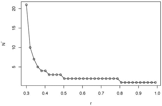 First, I fix and , as in Figure 1, and calculate the optimal sizes for various values of r in . Figure 2 illustrates the result.