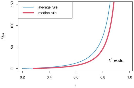 Note that depends only on r and the precision ratio because and does so: See the necessary part of the proof of Proposition 2. Since is the single peak of the continuation of with respect to N, in (18) is mainly determined by them. However, strictly speaking, depends on not the precision ratio but the pair in general. This is because cannot be written as the function of r and and it is impossible to decide which of and the optimal size is equal to only with the values of r and .